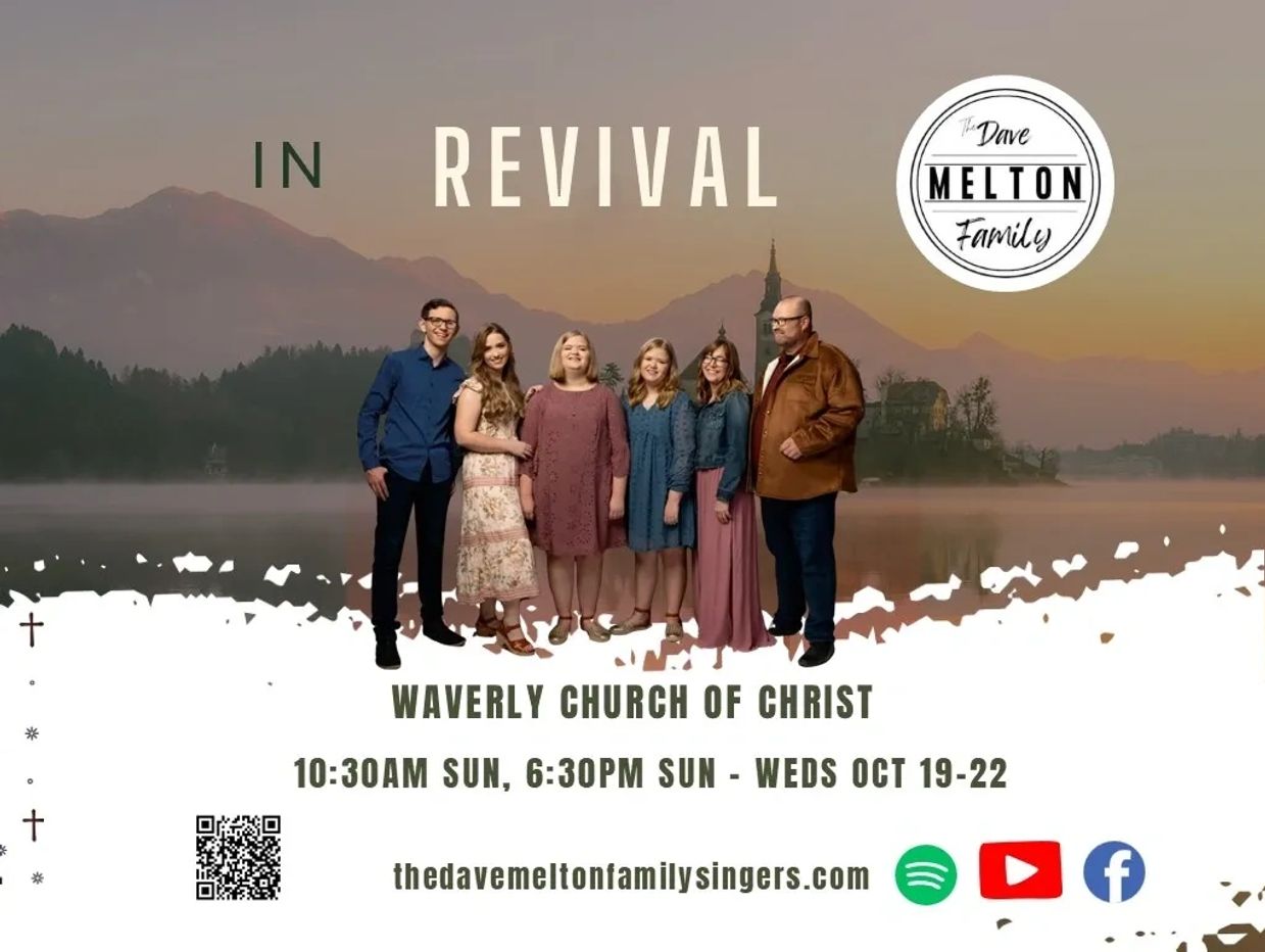 We would love for youto join us for a special time of worship and renewal during our Fall Revival, October 19–22, 2025 at the Waverly Church of Christ (100 David Road, Waverly, OH). We believe this revival will be a time of encouragement and joy as we come together to worship, learn, and grow. Please keep these services in your prayers, and we hope you’ll make plans to be with us.